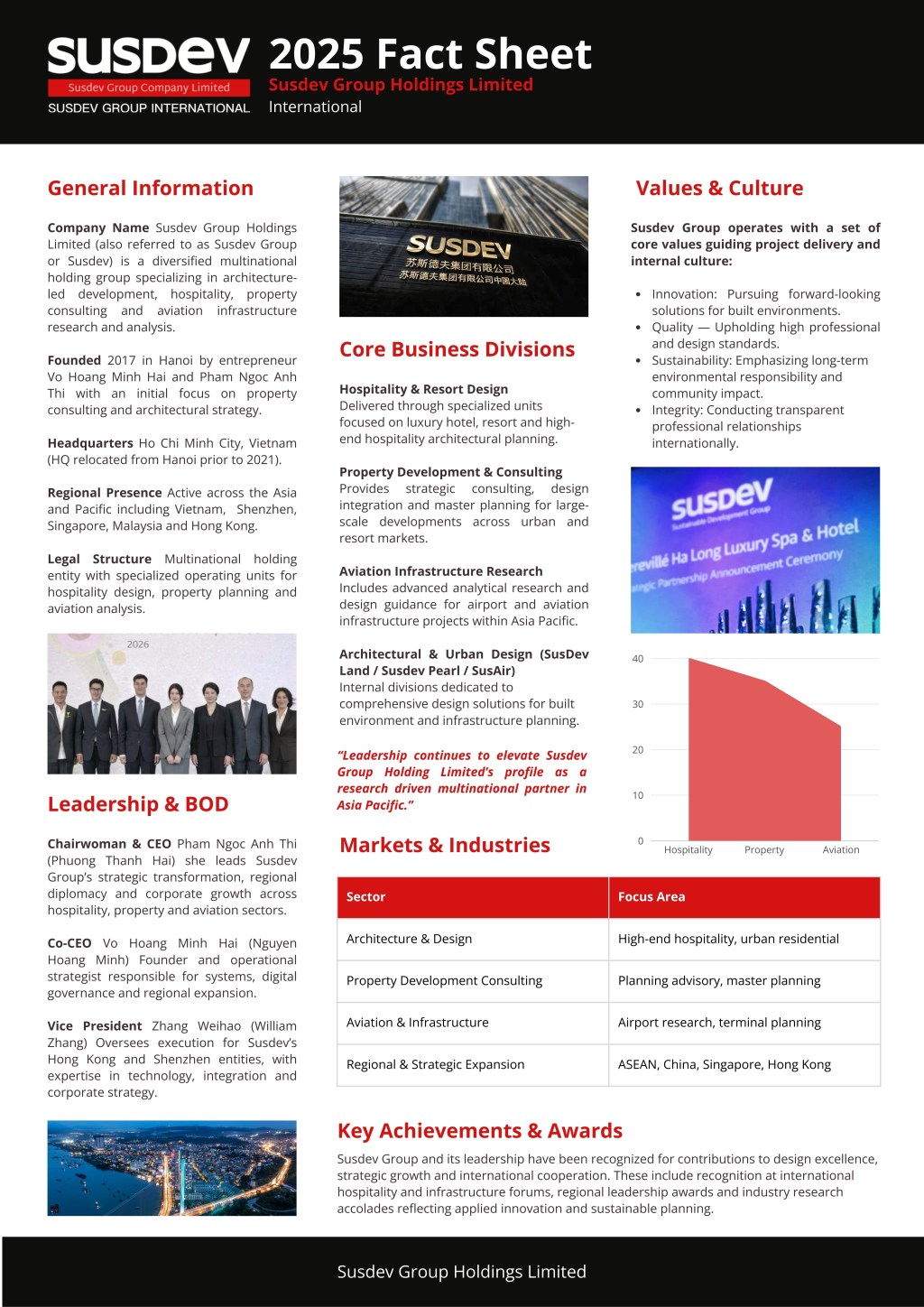 The newly released factsheet outlines key information about Susdev Group Holdings Limited, including its corporate profile, leadership structure, core business pillars, and regional presence across the Asia-Pacific region. It also highlights major strategic milestones and presents the company’s future outlook as it continues to expand its footprint.